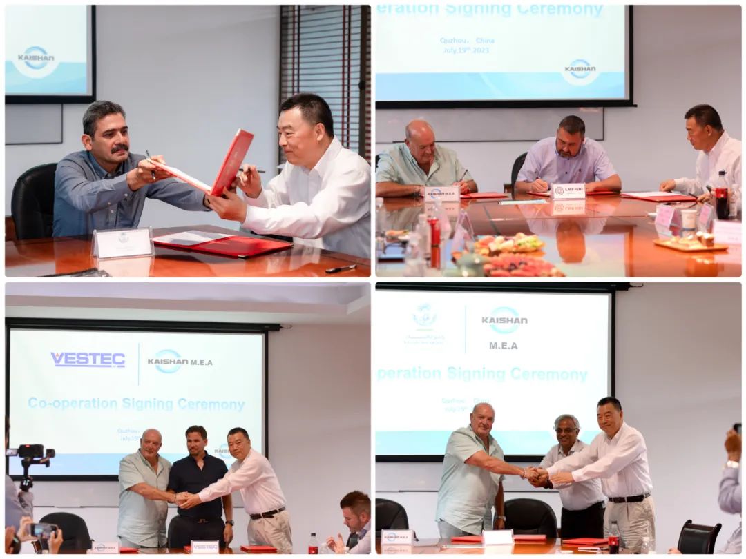 在開山控股集團(tuán)有限公司董事長曹克堅(jiān)先生的見證下,Kaishan MEA CEO Mr.John Byrne分別與沙特阿拉伯Kanoo公司、阿聯(lián)酋/巴林Kanoo公司、挪威Vestec公司、愛爾蘭LMF-GBI簽署了戰(zhàn)略合作儀式。