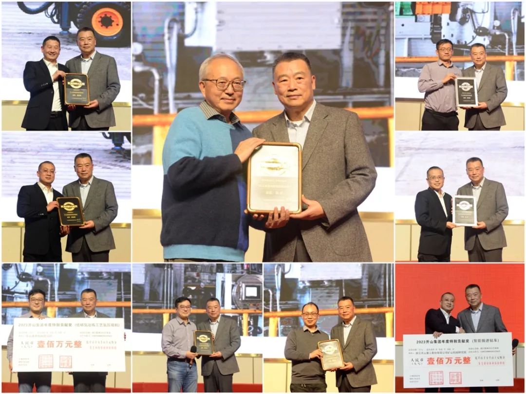 今年年會的重頭戲是首次頒發(fā)的特別貢獻(xiàn)獎。今年的創(chuàng)新特別貢獻(xiàn)獎分別授予了開山重工集團(tuán)股份有限公司研究院研制的智能掘進(jìn)鉆車和開山通用機(jī)械研究院研制的低碳?xì)湟睙捁に嚉鋲嚎s機(jī),這兩項科研成果在國內(nèi)市場創(chuàng)造了較好的經(jīng)濟(jì)效益和社會效益。集團(tuán)委托上海造幣廠特制的純金獎牌頒發(fā)給了湯炎博士以及夏劍輝、徐雪峰、惠登峰、田兵兵等四位高級工程師;另有純銀獎牌頒發(fā)給了技術(shù)團(tuán)隊參與兩項創(chuàng)新產(chǎn)品開發(fā)的工程技術(shù)人員。